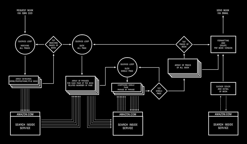 The group behind the project exploited Amazon's "Search Inside the Book" function, which allows customers to have a customized preview of books through snapshots of their content. A software developed by Paolo Cirio was capable of extracting the entire text of the book by recursively using Amazon's function with the latest words of each sentence. The text was then reassembled in a PDF file.The materiality of the book, characterized by OCR and positioning mistakes, makes the scanning process visible. In this way the resulting books become a materialization of the scraping process. The artists also released a text describing the artwork in which they claimed to have stolen the invisible. The artists ask: "What is the difference between digitally scanning the text of a book of yours, and obtaining it from Amazon Noir? There is no difference".
